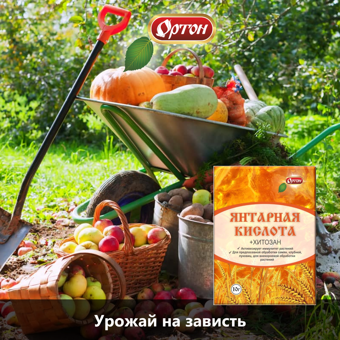 В августе лето подходит к завершению и теплых, светлых дней, ценных для растений, становится все меньше. Начинаются дожди и 💨 прохладная погода. Чтобы множество сил, трудов и забот, которые были вложены в новый урожай, не пропало даром, а растения во время последнего летнего плодоношения принесли максимум плодов, важно обеспечить им дополнительное питание. В период, когда плоды наливаются соком, огромное значение имеет правильная подпитка. 💦 Как и любому растущему организму, томатам, перцам, баклажанам и другим растениям необходимы питательные вещества. Препарат «Янтарная кислота» от компании «ОРТОН» помогает подпитывать растения на всех стадиях развития, в том числе во время созревания плодов. Это возможно даже при отсутствии благоприятных погодных условий. Основной компонент в составе препарата — органическая янтарная кислота естественного происхождения, природный 🌱 антиоксидант, который отвечает за завязывание плодов и устойчивость растений к холоду, что актуально в конце лета.