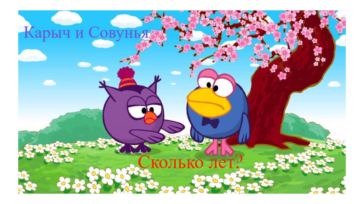 Не с проста я взял именно этих героев из известного мультфильма - 'Смешарики'. Поскольку большинство считает их одного возраста, но какого именно? Давайте разбираться. Но перед началом я уточню, что точной цифры здесь нет, ведь создатели не говорят о возрасте и поэтому всё пришлось делать фанатам. Теория №1: Сова и Кар-Карыч - пожилые, они сами об этом говорят в сериале, но не слишком старые, ведь они могут заниматься спортом и даже делать солнышко. Но сколько же именно им лет. Здесь давайте обратимся к серии - 'Психолог', где Карыч вспоминает свою молодость и натыкается на фотографию где он юный играет на гитаре с ожерельем хиппи. Расцвет хиппи был примерно в конце 60-х, в начале 70-х годов, значит что он родился во второй половине 40-х годов. Основные события Смешариков протекают в середине нулевых. При всём этом получается, что ему примерно 60-65 лет. Примерно столько же и Совуньи. Теория №2: Это история очень не логичная, но интересная. В доме Совуньи на стене можно найти плакат