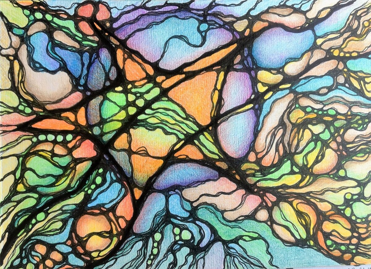 Тема: Имплантация зубов самым благоприятным для меня образом. Остался последний этап через два дня. Выброс получился из сплошных острых углов, отметила, что страх как колючка, а уколов я боюсь с детства вплоть до обмороков, был негативный опыт заражения через шприц. Затаила дыхание от увиденного масштаба остроты, медленно выдохнула. Хотелось поторопиться, колкость резала глаза и объем скругления. Спина напряглась, плечи опустились от тяжести, шея втянулась, вся сжалась расслаблялась несколько раз, пришла успокоительная мысль, «глаза боятся - а руки делают», Нейрографирую линии выброса и с удивлением наблюдаю как из них получается ужасная каракатица на листе. Переключила мысли на то, какая я молодец, что сбежала из другой клиники к этому хирургу, у него и руки золотые и общение на духовном уровне и юмор, и передовые технологии. Понимаю, что меня не отпускает. И вот уже большой круг, и выброса уже нет, и на месте каракатицы стала проявляться своими гранями моя звезда. И каждый луч звезд