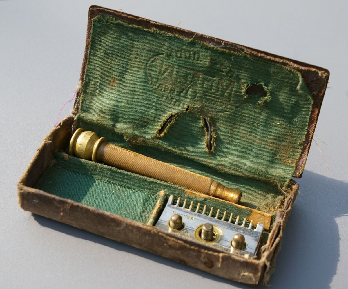 Приобрёл бритвенный прибор артели "Интом" в дряхлом футлярчике. Такой прибор в коллекции есть, купил из-за гребёнки, "замена по позиции". В коллекции был станок с такой вот "ископаемой" гребёнкой. Новая выглядит так. Это самая первая гребенка артели с тройным клеймением, 1928 - 1929 годы. Ниже - последовательность изменений в клеймении в сторону упрощения, 1928 по 1935 годы. Дорожный бритвенный прибор ленинградской артели "Бритпром". Похоже, он выпущен в 1940 году к 70-летию Ленина. Барельеф с его профилем "украшает" футляр. Барельеф, надо сказать, халтурный, рельеф практически отсутствует. Про 1940 год написала и продавец этой вещи. Теперь в коллекции стало на один набор "Бритпрома" больше. Дорожный, сувенирный бритвенный прибор одесской артели "Техпласмасс", конец 1950-х. Артель возникла в 1938 году. Купил зеркало для бритья в коллекцию, оно оказалось кустарной работы. Разобрав его для чистки деталей, обнаружил между зеркальным стеклом и задней стенкой рамки резанную бумагу для упло