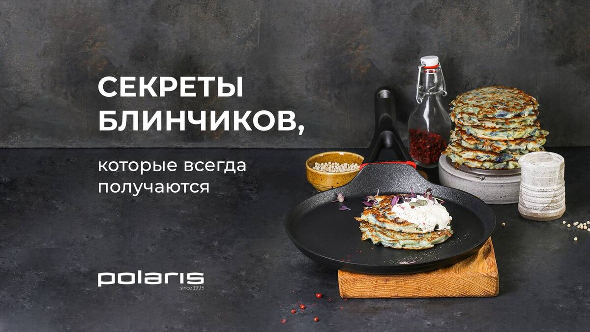 Секрет №1 Первый секрет — это, конечно же, хорошая сковорода. Чтобы блины не подгорали и равномерно прожаривались, используйте блинную сковороду Polaris PRO collection-24PC. Она изготовлена из алюминия с антипригарным покрытием нового поколения DIAMANT-3X PRO, поэтому для жарки достаточно самой маленькой капельки масла. А еще вы можете почувствовать себя заправским поваром, подкидывая блинчики вверх! Ручка сковороды имеет эргономичную форму, что обеспечивает максимальное удобство и безопасность во время готовки. Сковорода подходит для всех типов плит, включая индукционные. Секрет №2 Чтобы блинчики были тонкими и эластичными, выбирайте среднюю жирность молока или кефира: от 2 % до 3,5 % жирности.