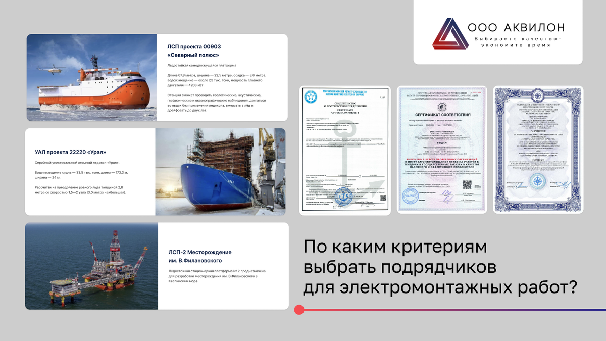 Выбор подрядчика – это важный этап реализации проекта строительства, с которым сталкивается практически любая строительная организация. От правильного выбора подрядчика зависит соблюдение сроков, объем сметы и качество выполненных работ. Чтобы избежать таких трудностей большинство опытных компаний используют два подхода к выбору подрядных организаций: 1. Проведение по каждому объекту конкурса или тендера среди всех изъявивших желание компаний. 2. Выбор по наиболее важным критериям из ранее сформированного реестра потенциальных подрядчиков. Основными критериями выбора добросовестного подрядчика являются: Компания ООО “Аквилон” готова предоставить своим потенциальным заказчикам весь указанный перечень документации и гарантирует быстрое и качественное выполнение работ. При проведении проверки важно не верить буклетам и комментариям подрядчика. Стоит ориентироваться только на факты в виде документов и цифр, которые заказчик всегда имеет право запросить у подрядных организаций. Эти документ