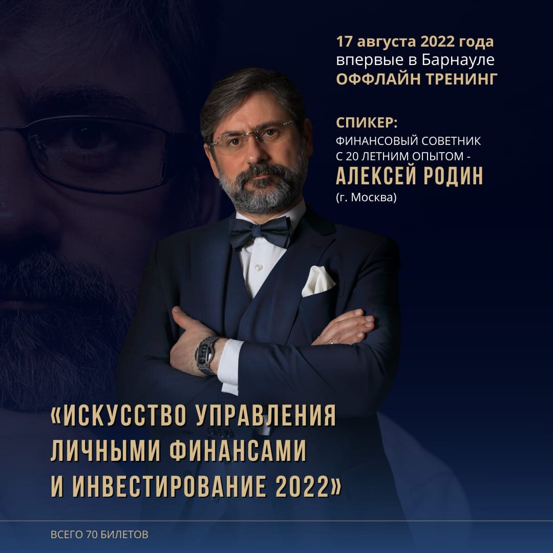 17 августа с 10:00 до 17:00 в Барнауле пройдет тренинг федерального эксперта из Москвы, независимого финансового советника глав семей Алексея Родина на тему: «Искусство управления личными финансами и инвестиции 2022». На этом тренинге вы проработаете свои финансовые цели, определите способы оптимизации личного бюджета, составите стратегию управления личными финансами, пропишите понятную стратегию инвестирования для текущей ситуации, а также разберётесь с тем, как привить финансовую культуру своим детям. Подробная программа тренинга и стоимость билетов указана на сайте: trainingfinance.ru Где будет проходить: ул. Мало-тобольская, 19 «Центр Мой бизнес», 3 этаж, большой конференц-зал. Регистрация с 9:30, начало в 10:00. Все вопросы можно задать организатору по телефону: +7 (913) 229-67-51 (Роман Полосьмак) P.S. Осталось всего 25 билетов! Об эксперте: