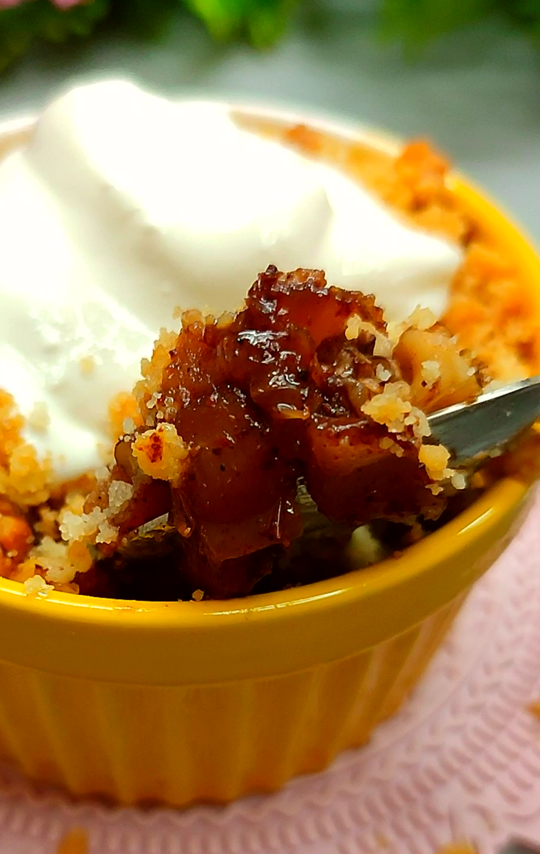 Друзья, не могу не поделиться этим десертом — он восхитителен, правда! Если вы вдруг не знали — Крамбл — это такой английский десерт по типу пирога, представляющий собой запеченные фрукты или ягоды, посыпанные крошкой из песочного теста. По сути он прост, но очень вкусный. Готовить крамбл можно в обычной большой форме и порционных формочках — последний вариант более удобен, так как крамбл не пирог и аккуратно разрезать и раздать его на порции не так-то просто. Итак, здесь я делюсь с вами рецептом крамбла с яблоками. Продукты рассчитаны на 4 небольшие порционные формочки. 🔹Ингредиенты 🔹 ✔Яблоки – 3 средних. ✔Сахар для начинки - 40 г ✔Лимонный сок — 1 ст. л. ✔Корица — 1 ч. л. (по желанию). ✔Грецкий орех — 40 г. Крошка: ✔Мука — 100 г ✔Сливочное масло —50 г ✔Соль — щепотка. ✔Сахар— 1 ст. ложка ✔Немного слив. масла для смазывания формочек. ✔Щепотка любви и хорошего настроения (обязательно). Приготовление ✅Яблоки порезать мелкими кубиками (по желанию можно почистить). ✅Сахар высыпать на