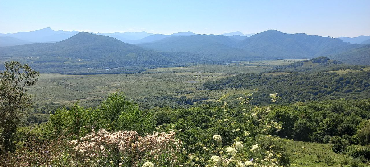 Утром, сдав номер, мы отправились в путь. Навигатор показывал около 30 км в сторону Плато Лаго-Наки. Дорога отличная, машин мало, асфальт очень хороший. Вот только пришлось с газа переключиться на бензин, потому что подъем достаточно крутой и авто не тянуло. По дороге мы увидели смотровую площадку, остановились и сделали фото, дочка в бинокль посмотрела. Вид отличный, камера не передаст тех эмоций!