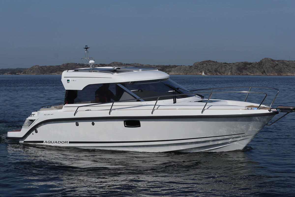 Aquador 25 HT - это идеальная лодка для однодневных поездок и ночевок благодаря просторному кокпиту с кухней и диванами, носовой каютой с двумя отдельными кроватями, отдельным туалетом, с проходом на нос . Платформа для купания обеспечивает удобный доступ к воде на отдыхе, а дверь в корме облегчает вход в рубку. Ходовой тент являет собой горизонтальный навес над кормой, что обеспечивает не только хорошую его устойчивость при движении, но и возможность закрепить его так, чтобы он не закрывал круговой обзор.