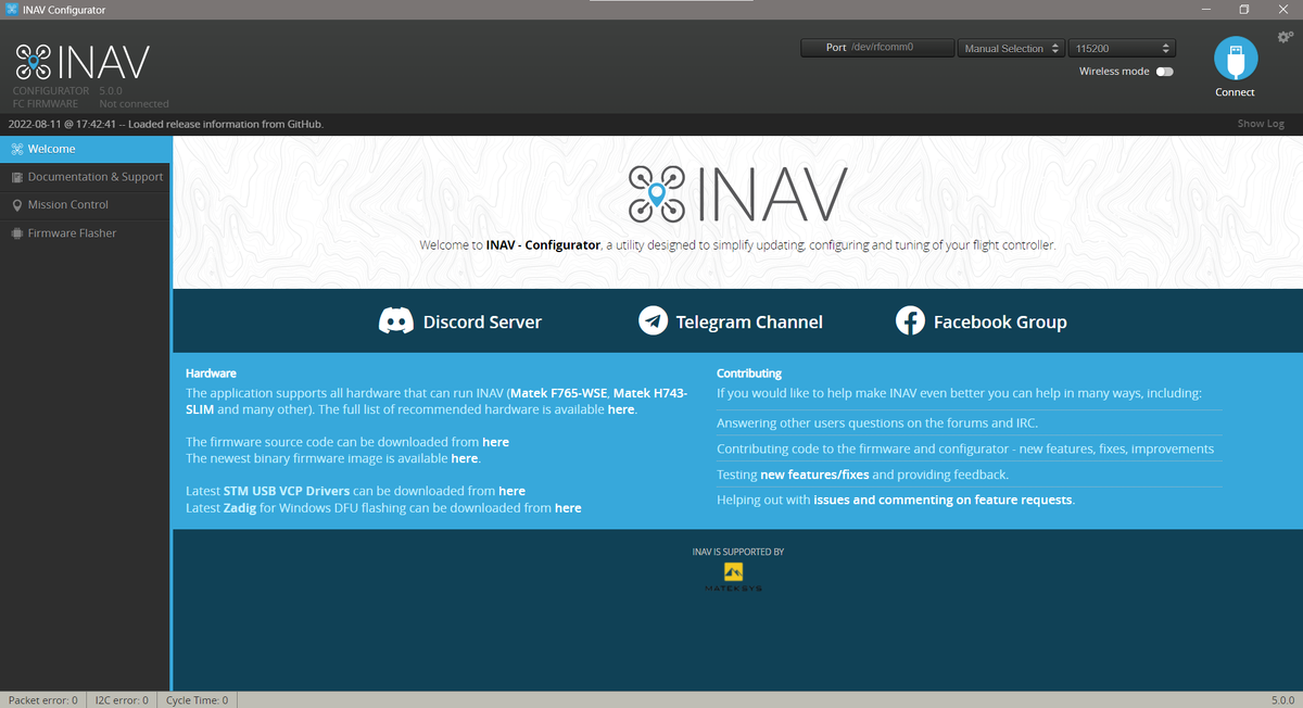 Обратите внимание на версию конфигуратора. Он работает с прошивками соответствующей версии. Если вы хотите прошить INAV 3, то конфигуратор тоже нужен версии 3, если 4, то 4 и т.д. На данный момент последняя версия это 5.0, её я и возьму.