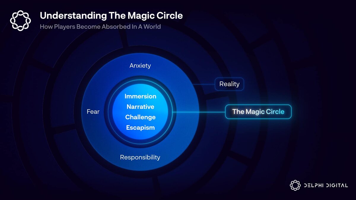 Еще одна модель, которую команда Delphi Gaming изучает в последнее время, называется PlayFi, впервые разработанная NOR. Мы считаем, что эта модель уникально хорошо подходит для киберспорта и соревновательных игр, и Delphi будет активно поддерживать проекты, работающие над этими идеями, продвигаясь вперед. Чтобы лучше объяснить это, стоит пересмотреть концепцию магического круга в играх. Это плавное состояние истинной свободы действий и свободы игрока, не испорченное окружающими силами, соперничающими за внимание человека, - вот почему великие игры выдерживают испытание временем.