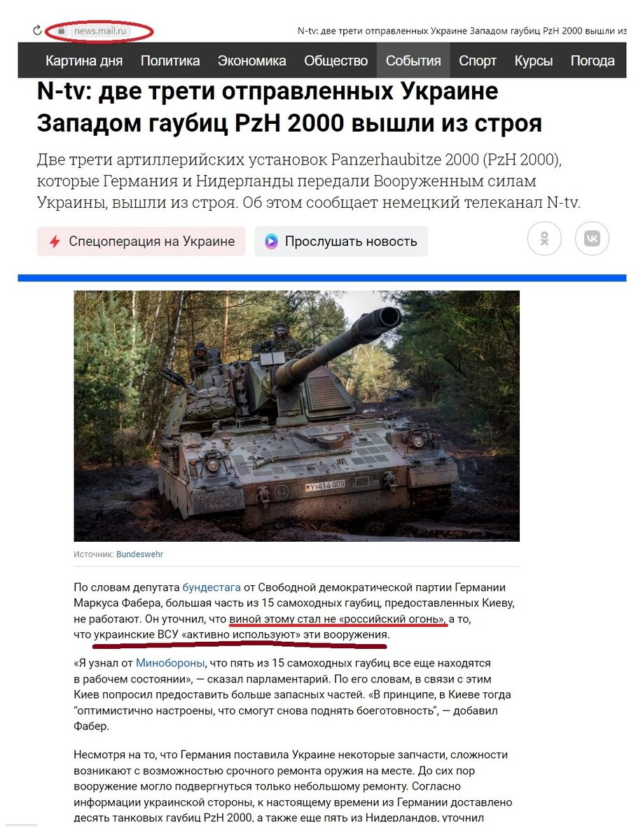 Когда надо сообщить о какой нибудь победе, а писать нечего, а думать не умеем? Майл.ру похвастался в новостной ленте, что поставленные бундестагом (Германией) гаубицы PzH 2000 вышли из строя. И не просто сколько-то, а 2/3! Правда позже рассказывают что их там не несколько десятков или сотен, а всего 15 штук рассказали. Но самое интересное, это причина их вывода из строя, их не уничтожили или подбили наши доблестные освободители, а их активное участие ВСУ! Вы можете представить, вся новость в том, что украинские вооруженные силы используют активно западную военную технику, думаю ни кому не надо объяснять что делают гаубицы? Так вот украинские силовики их до износа допользовали и 10 штук нуждаются в ремонте и запчастях. Вопрос, это нам для чего сообщили? Чтобы мы порадовались, как активно работает против нас НАТОвское вооружение? Для тех кто не видел как работает это смертоносное оружие. Посмотрите что она из себя представляет и её особенности: Сравнительные характеристики с аналогичн