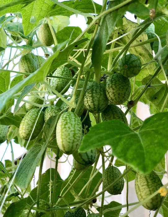 Мелотрия шершавая (она же мексиканский огурец, мышиный арбуз, кислый корнишон) – экзотическая лиана семейства Тыквенные, вызывающая интерес своей буйной зеленью и оригинальными полосатыми плодиками. Буйно разрастаясь, эта диковинная культура за короткий срок создаст зеленую стену или оплетет любое сооружение, оказавшееся рядом. Родина мелотрии – Африка. В нашем климате ее выращивают как однолетнюю культуру, высевая семена на рассаду за 15-20 дней до высадки в грунт. Почву лиана предпочитает плодородную. Полив редкий, но обильный. Растение устойчиво к похолоданиям и плодоносит до самых заморозков. От других тыквенных отличается отсутствием вредителей и болезней. Мелотрия сильно разрастается – ее плети достигают в длину 3 метров. А благодаря множеству боковых побегов растение быстро и плотно оплетает опоры. Плодоносить она начинает в июле. Небольшие полосатые плоды (всего 2-2,5 см.) по вкусу напоминают огурец. Едят их молодыми, пока они ароматны и нежны. Делают из них салаты, а также мож