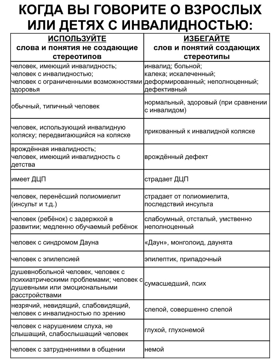 Многие привычные нам слова, понятия и фразы, в том числе употребляемые по отношению к людям с инвалидностью, по сути своей «ярлыки» и оскорбительные стереотипы. Нежелательные фразы вызывают чувство обречённости, беспомощности, сочувствия и жалости. Пожалуйста, запомните, эти фразы некорректны, потому что оскорбительны для людей с инвалидностью. Инвалидность- это социальное, а не медицинское понятие. #инсульт #инвалидность #реабилитация #лфк #здоровыйобразжизни #инвалиднаяколяска