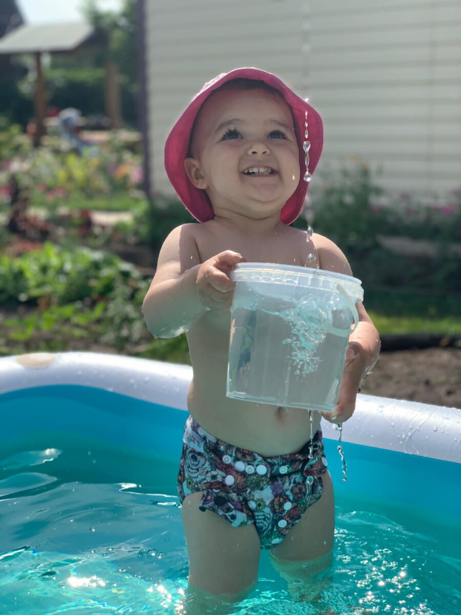 Почти неделю жили у бабушки-дедушки на даче. Вот же доче там раздолье! Сколько нового сразу узнала Катя (1 год 8 месяцев), рассказываю по порядку. Катя весь день на улице, кушать тоже хочет только на улице в беседке. Сама хочет собирать чёрную смородину и малину, только так с куста может есть ягоду. Собирает очень аккуратно, складывает в ведёрко. Сразу всё поняла и научилась обходить грядки, ходит осторожно только по дорожкам. За день проходит огромные расстояния: от меня к бабуле и обратно, потом к дедуле и снова ко мне бежит. И так весь день. С удовольствием занимается ботаникой. Изучали с ней как растут помидоры, перец, фасоль, горох, лук, чеснок, капуста, баклажаны, разные фруктовые деревья. Вместе собирали огурчики, выдергивали морковку. Я надеялась, что после этого захочет морковку съесть, но нет, пока никак - Катя ни один корнеплод не любит ни в каком виде. С удовольствием зашла в посадки картошки, там же я ей делаю песочницу и сразу после такой забавы окунаю в воду, ведь доча