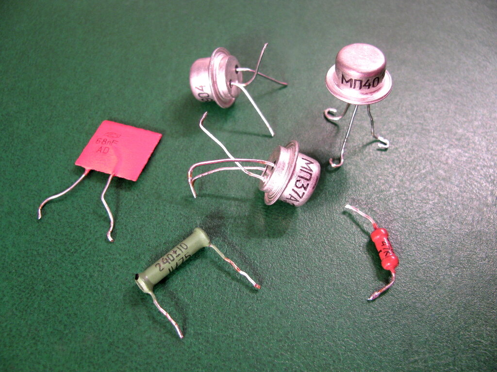 Подобрал и транзисторы. Высокочастотный П416, для второго каскада МП37A и для оконечного каскада МП40. Вот только проверить тестером их, прозвонив переходы, на исправность, не сообразил. Ну и что, что они уже использовались и выводы у них паяные? Раз лежат в пластмассовой коробке вместе со всеми остальными ‒ значит рабочие!