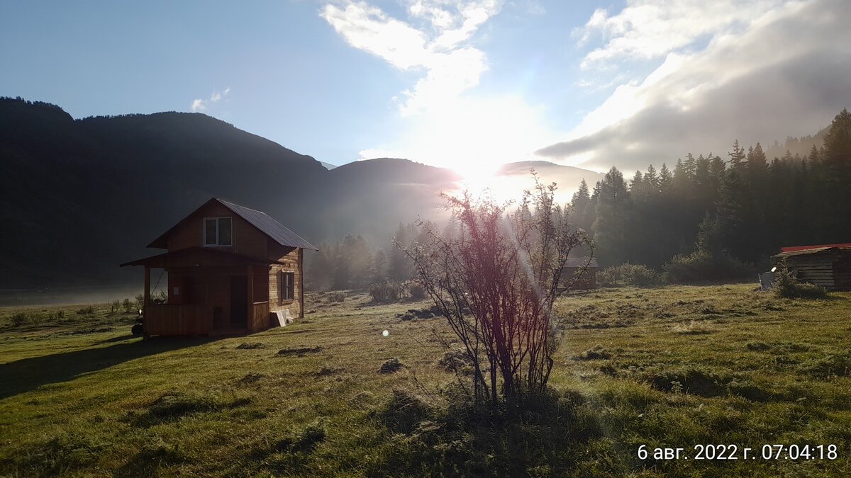 Проснулась в семь утра. Жалко дальше в "кровати" валяться. Тихонько встала и выползла на улицу. Кругом волшебно. Я вообще безумно люблю утро в горах. Люблю пить кофе и наблюдать , как крадется туман по горе. Его видно прямо. Он какой то густой тут. Солнышко уже давненько из за горы выбралось. Уже во всю освещает своими лучами. Пытается дотянутся под каждый камешек. Начинает теплеть. Вечером то мы чуть не дали дуба. Вот вам и начало августа. Курточки напялили, одеяло на лавочку постелили.. Говорят, что тут разительно холодней даже от того же Чемала. Да и не мудрено- высота то то какая. Чемал находится на 428 метрах( над уровнем моря? Какая то высота центра стоит) а Акташ на 1500. Мой дорогой супружник из домика вышел. Очень хочется кофе. Но еще не включали генератор. База нулевая, вот только вот введена в эксплуатацию. Все есть- и кабина душевая. И удобства. Света только нет. Включают генератор до часу ночи с семи вечера( когда мы только приехали малость прибалдели,что телефон, кот