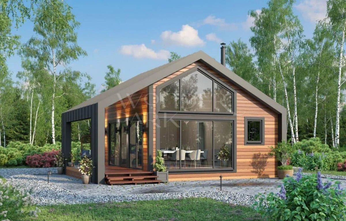 Общая площадь строения -48 кв.м. Ширина и длина -6 метра и 8 метров Высота- 4 метра Вес -8 тонн Проект красивой бани в стиле барнхаус размером 6 на 8 метра. Размеры негабаритные для перевозки, поэтому строительство будет осуществляться на участке. Планировку бани, расположение окон, дверей возможно поменять в зависимости от расположения бани на вашем участке. Стандартная комплектация включает в себя: