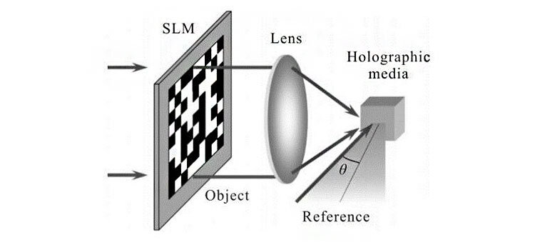 Во время операции записи голографической памяти выход лазерного луча разделяется на два луча, один из которых расширяется, а затем проецируется на носитель записи в качестве эталонного света. После расширения другого лазерного луча он отражается от поверхности записываемого объекта и, как объектный свет, также проецируется на носитель записи. Объектный свет используется для переноса данных, которые расширяются, чтобы иметь возможность полностью освещать весь модулятор стереофонического света (SLM). SLM похож на ЖК-панель, которая отображает двоичные данные, которые должны быть сохранены в массиве светлых и темных пикселей в виде полной страницы. После того, как свет объекта проходит через SLM, некоторые из них загораются, а некоторые тускнеют, что должно нести данные страницы. Затем тот же эталонный свет воздействует на носитель, превращая всю страницу данных в интерференционную картину полос, и вся страница данных сохраняется в носителе посредством интерференционной картины.