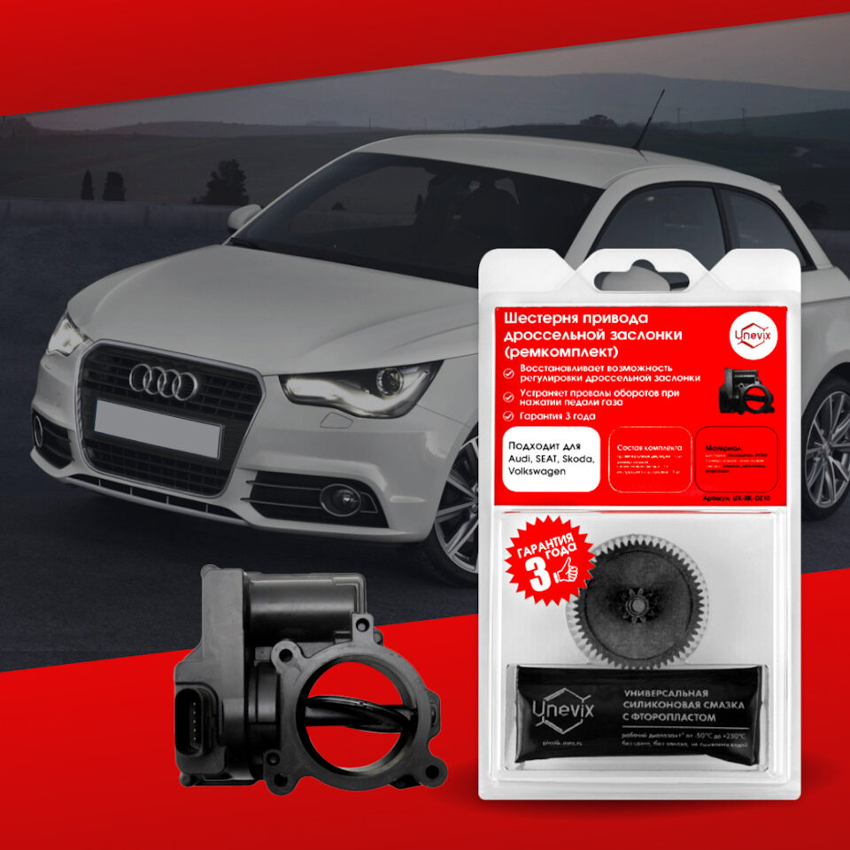 Вы — владелец автомобиля Audi, Seat, Skoda или Volkswagen? Дроссельная заслонка вашего автомобиля работает некорректно? Как решить проблему? Первое, что нужно сделать – пройти диагностику с помощью электронного сканера. Сделать это можно в ближайшем автосервисе или самостоятельно при наличии подходящего оборудования. В большинстве случаев причина неисправности – износ шестерни в приводе. Восстановить привод дроссельной заслонки легко с помощью ремкомплекта! Состав комплекта: