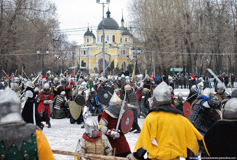 На стадионе в Таганском парке собираются рыцари и лучники, участвующие в состязаниях по историческому фехтованию. Такие турниры проходят в Москве в любое время года, зимний турнир на Таганке называется «Новогодние манёвры». Подготовка защитной экипировки к битве занимает немало времени: историческое фехтование – не костюмированный спектакль, здесь бойцы наносят друг другу реальные удары. Девушкам обычно отводится роль лучниц. Облачившись в латы, бойцы делятся на две команды, примерно равные по силам, а в качестве опознавательных знаков своих и чужих используются ленты разного цвета. Бугурты (сходки стенка на стенку) следуют один за другим. За пару минут большинство бойцов оказываются повержены, судьи объявляют команду-победителя и вскоре начинается очередная схватка. Это только в кино можно увидеть красивые крупные планы сражения, на деле средневековая битва напоминает мясорубку – «смешались в кучу кони, люди»…