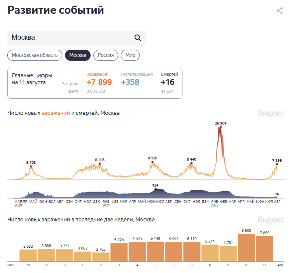 Итак, летняя волна не пошла на убыль, а все еще поднимается. Мы фактически достигли по числу заражений по Москве уровня предыдущих четырех первых волн (кроме пятой, зимней, связанной с "омикроном"). Незначительно пока, но стала расти и смертность.
