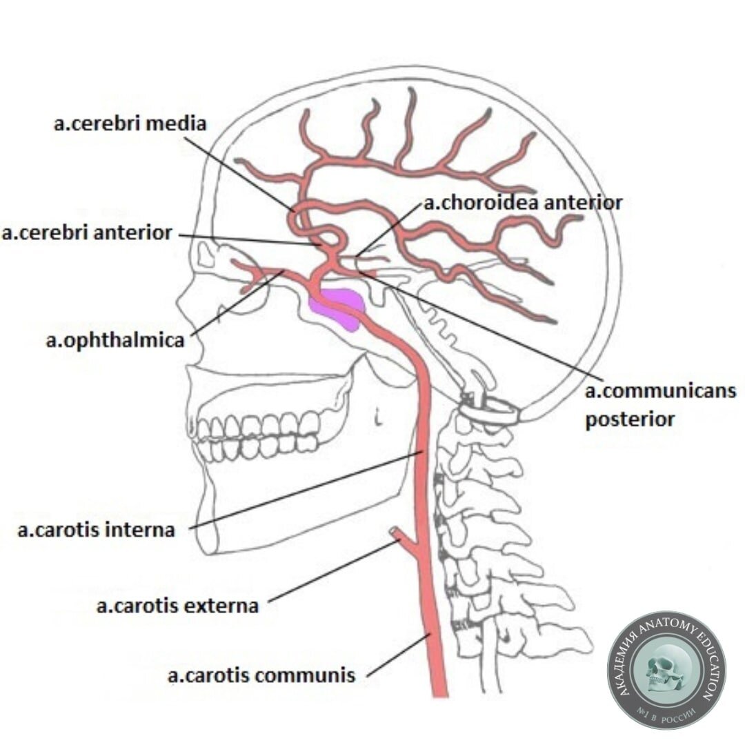 Дорогие друзья! Лето потихоньку подходит к концу, новая учебная пора всё ближе и ближе 😅 Вы начали уже готовиться или не заканчивали? 💬 ℹ️ Arteria carotis interna Внутренняя сонная артерия, a.carotis interna - парная артерия, кровоснабжающая органы головы и шеи На ее протяжении выделяют 4️⃣ части 1️⃣Шейная часть, pars cervicalis ⁃ включает отрезок артерии от момента деления общей сонной артерии до наружного отверстия canalis caroticus ⁃ в самом начале имеет расширения - каротидный синус (рефлексогенная зона) ⁃ в этом сегменте ветвей не даёт 2️⃣Каменистая часть, pars petrosa ⁃ включает в себя отрезок a.carotis interna, проходящей в canalis caroticus височной кости ⁃ даёт aa.caroticotympanicae и a.canalis pterygoidei 3️⃣Пещеристая часть, pars cavernosa ⁃ проходит в области одноименного синуса ⁃ даёт ветвь a.hypophysialis inferior, кровоснабжающую гипофиз, а также ветви к оболочкам мозга, намету мозжечка и ветвь к пещеристому синусу 4️⃣Мозговая часть, pars cerebralis ❗️кровоснабжает