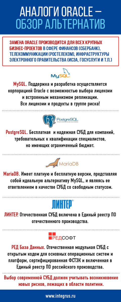 Западный софт компаний Microsoft, Oracle, SAP покидает российский рынок. Программные продукты, установленные на серверах (кроме облачных версий) продолжают работу в рамках лицензии без обновления и технической поддержки. Государственные компании, работающие в сфере финансов, телекоммуникации, электронного правительства, ранее использовавшие СУБД Oracle, вынуждены искать замену. В первую очередь для импортозамещения следует рассматривать софт разработчиков из России и Китая, а также ПО из реестра Минкомсвязи. Требуются цифровые экосистемы со сходным функционалом, которые смогут хранить и обрабатывать данные, предоставлять бизнес-аналитику, управлять контентом, обеспечивать безопасность, надежность и масштабируемость серверов с установленными операционными системами. Лучшая альтернатива Oracle MySQL Решение допустимое, но рискованное, т.к. поддержка выполняется американской корпорацией Oracle. В любой момент ПО может оказаться «под санкциями». PostgreSQL СУБД для компаний с ограниченным