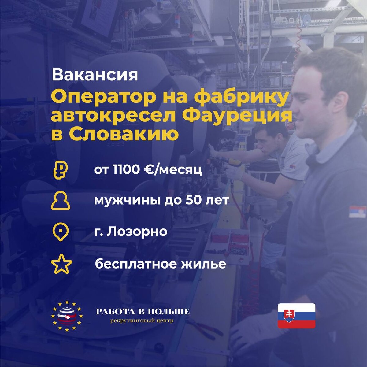 Предлагаем официальное трудоустройство с оформлением ВНЖ в Европейском Союзе. ❗Мужчины от 18 до 55 лет❗️ Что нужно будет делать? ✅ Работа оператором на линии, физически не тяжелая ✅ Изготовление автокресел на автоматизированном производстве ✅ РАБОТА В ЕВРОПЕ ЖИЛЬЕ 🏡 Предоставляется работодателем БЕСПЛАТНО 🏡 Евроремонт, вся необходимая мебель, вай фай, холодильник, кухня общая (на 2 комнаты), санузел 🚘 БЕСПЛАТНЫЙ автобус до работы ТРЕБОВАНИЯ: ❗️Без опыта работы ❗️Заграничный паспорт ❗️Знание русского языка ❗️Справка об отсутствии судимости + апостиль с судовым переводом на словацкий язык УСЛОВИЯ: ✅ Зарплата: от 1100 евро. 5 евро в час ✅ По приезде кандидату оформляют вид на жительство на 2 года за счет работодателя с возможностью продления ✅ Бесплатные программы миграции через отработанных полгода ✅ Авансы ✅ График работы: 8-12 часов ✅ Местоположение: Лозорно ✅Медицинская страховка — БЕСПЛАТНО ‼️В настоящее время доступны и другие вакансии, звоните нам, и мы подберем для Вас нужную в