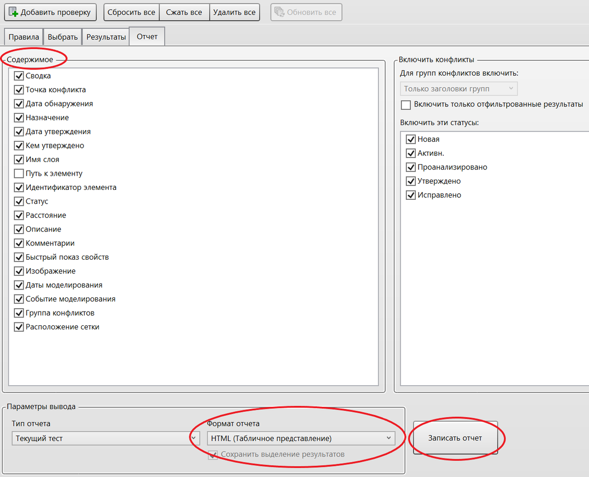 Приступаем к завершающему этапу - формирование Отчета о коллизиях. Переходим во вкладку Отчет. В окне Содержимое ставим галочки на тех пунктах, которые хотим отобразить в отчёте. Формат отчёта выбираем HTML (Табличное представление) – он самый удобный для восприятия. Далее нажимаем Записать отчёт и сохраняем в нужное место. Представленный отчет выглядит так: Передаем его исполнителю на устранение замечаний. P.S. Данная статья носит рекомендательный характер, основываясь на личном опыте.