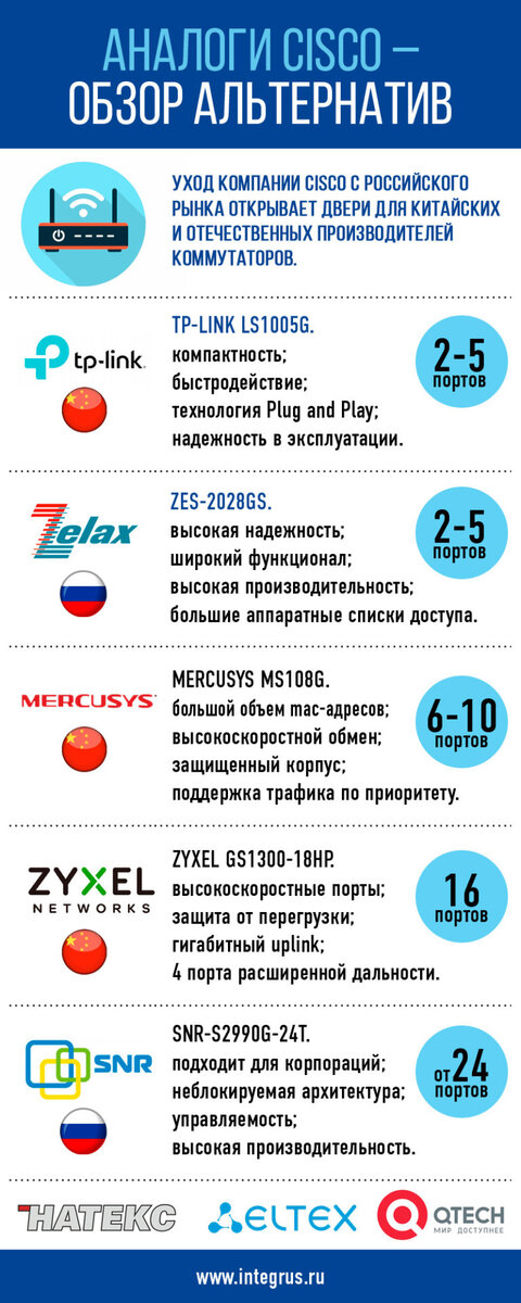 Cisco – производитель коммутаторов с мировым именем, отличительной чертой которых стали надежность и продуманный функционал, уходит из России. На его место приходят аналоги российских и китайских компаний, заработавшие неплохую репутацию, и отличающиеся простотой, функциональностью и долговечностью использования. Критерии, предъявляемые к сетевому оборудованию для коммутации От 2 до 5 портов Свитчи с малым количеством портов для домашней эксплуатации, подходят предприятиям малого бизнеса. От 6 до 10 портов Востребованы для организации работы офисов небольших размеров. От 16 до 24 портов Коммутаторы для больших компаний, офисов, предприятий. От 24 портов Свитчи для создания сети, способные удовлетворить профессионалов. Применяются при создании корпоративных сетей. Отечественные компании, производящие телекоммуникационное оборудование Выбор за вами! Подробнее: https://integrus.ru/blog/it-decisions/analogi-cisco-obzor-alternativ.html