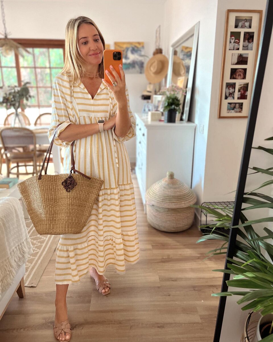 Кэжуал – это не только о практичности, в этом стиле есть гармония, красота и элегантность. Составить образ кэжуального направления можно из базовых предметов дамского гардероба. Ниже 10 простых и актуальных идей на каждый день от модной испанки 45+. Тандем горизонтальных и вертикальных линий на платье смотрится необычайно красиво. Наряд в теплых кремовых тонах омолаживает, подчеркивает благородный загар. Вместительный соломенный аксессуар добавляет образу практичности. Легкое платье с диагональным принтом – еще один стильный вариант на каждый день. Свободный крой не стесняет движения, обувь подобрана в тон основного наряда. Можно выглядеть элегантно не только в платьях, юбках, но и в любимых джинсах. Достаточно дополнить образ принтованной блузкой с V-образным вырезом, босоножками-вьетнамками и стильным аксессуаром геометрической формы. Розовый цвет выгодно освежает зрелую внешность. Монохромный ансамбль идеально подходит как для будничного шопинга и посиделок в кафе с подругами, та