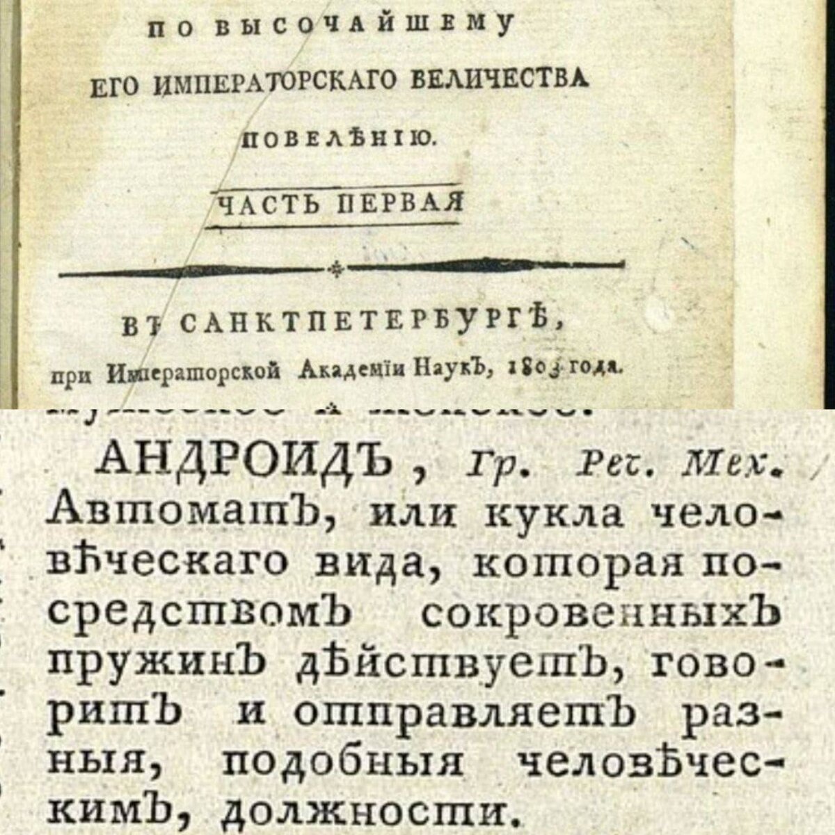 Официально понятие «андроид» впервые всплывает в патентах США от 1863 года как «миниатюрные автоматы, схожие с человеком». Но, внезапно, в толковом словаре при Императорской Академии Наук в Санкт-Петербурге это слово значится ещё с 1803 года. Это как понимать? Андроидов нет, а термин для их определения есть?