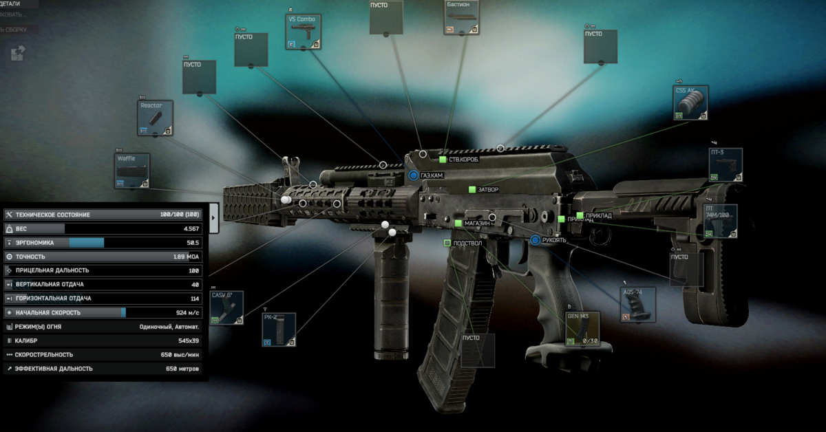 Обойдётся в ~261k руб. без учёт самого оружия, у торговца стоит 39к. руб. В этом варианте минимум отдачи, если хочется больше мобильности (эргономики) и магазин на 60 патронов, то можно ручку заменить на РК-01.