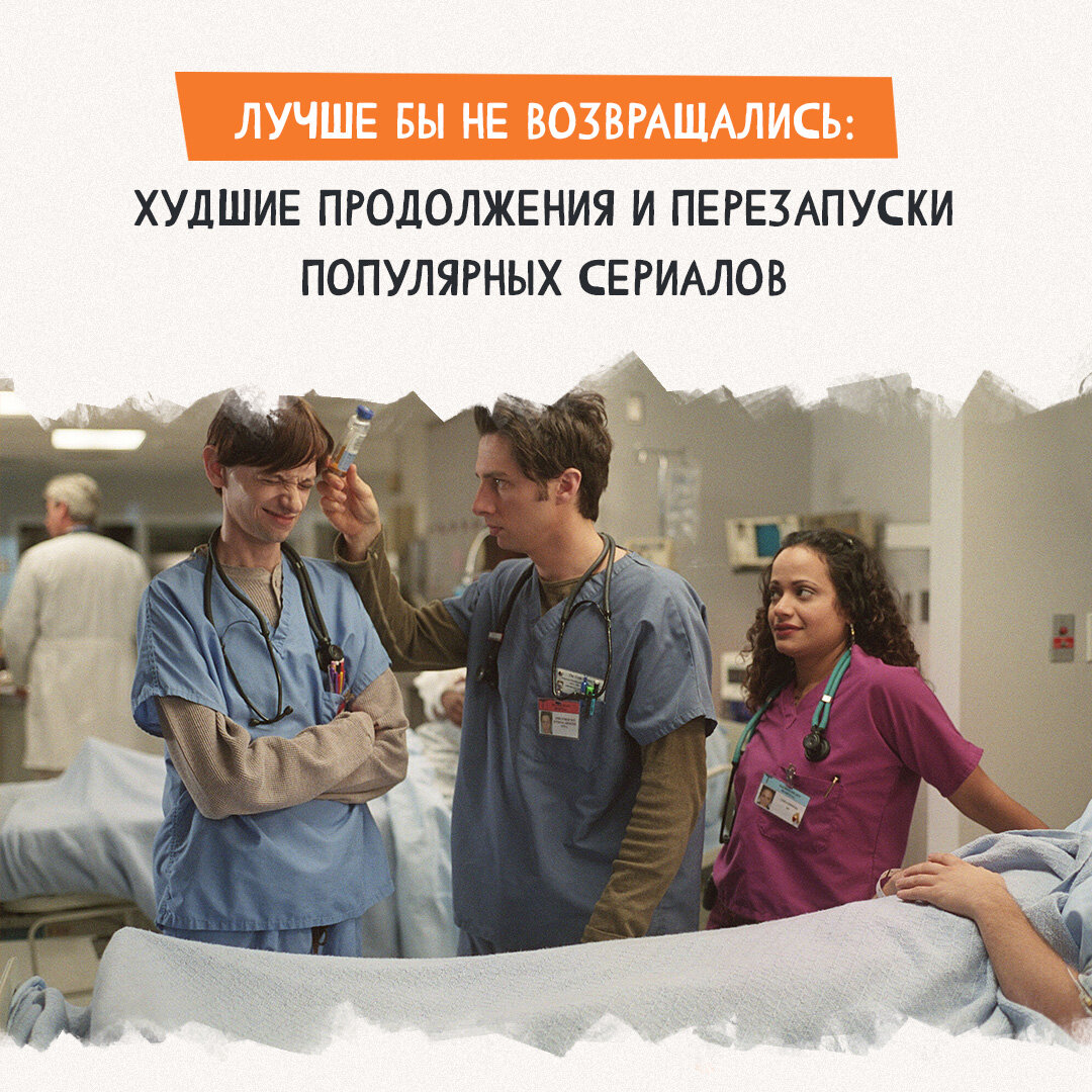 Фестиваль ATX TV принес хорошие новости для поклонников комедийного сериала «Клиника». Спустя 12 лет с момента закрытия проекта есть реальный шанс на его возрождение. Ребут подтвердили Дональд Фейсо (Терк) и Билл Лоуренс (сценарист). Как это будет? Никто не знает. Но Лоуренс намекнул на полный метр. 😉 Один раз «Клинику» уже реанимировали. Легендарный ситком о медиках должен был закончиться на 8 сезоне — двойная серия My Finale логично завершала сюжетную линию Зака Браффа, который после выхода финала неоднократно заявлял, что в продолжении сериала не вернется. Но увы, вернулся — 9 сезон показал самые худшие рейтинги в истории «Клиники» по просмотрам в США, а смещение акцента с клиники на медуниверситет кардинально испортило фанатам очарование от оригинального сериала. Нередко погоня за деньгами превращается в ненависть армии фанатов. Мы решили вспомнить другие популярные сериалы, которые возвращались на экран после долгого перерыва. Возвращались и разочаровывали... По промокоду dzenfri