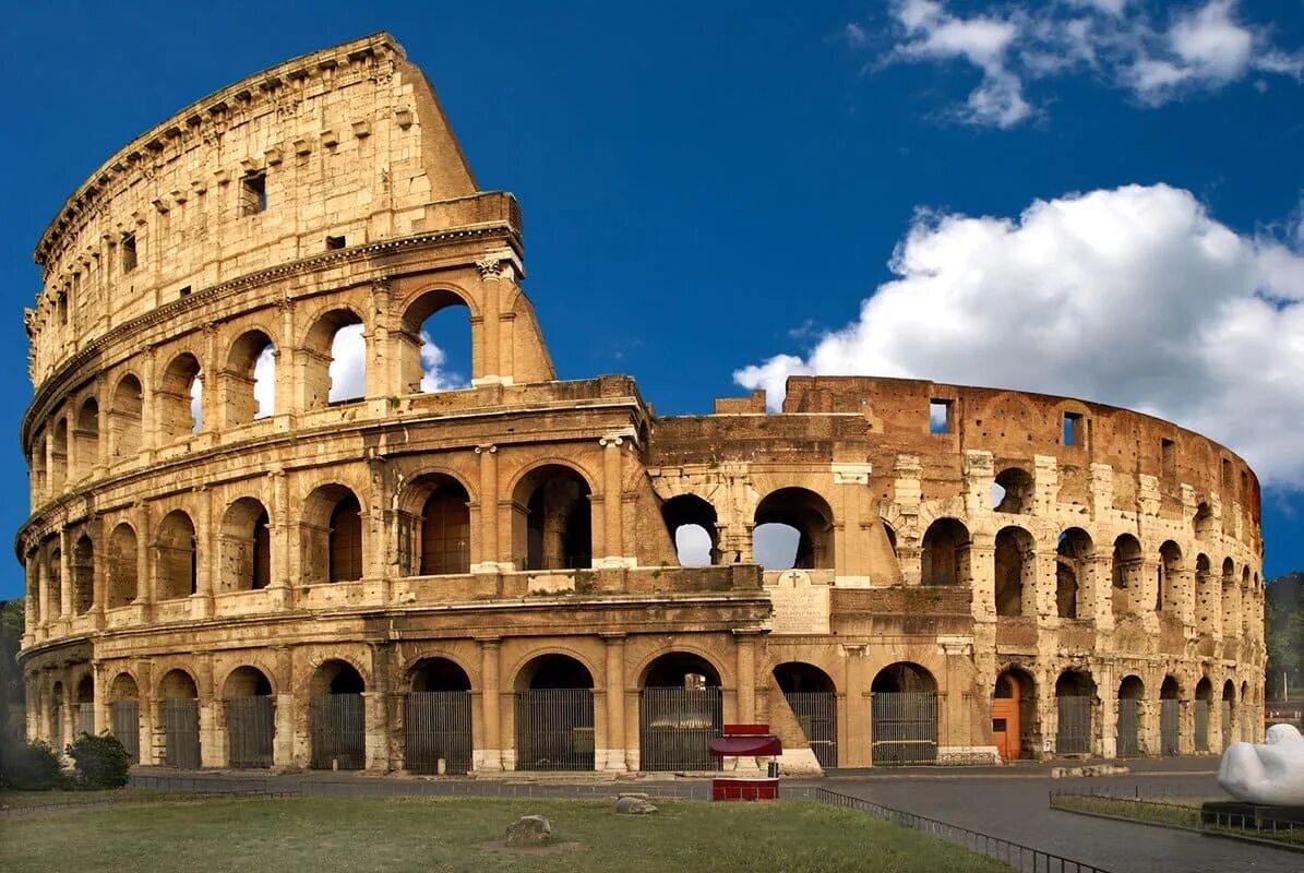 Колизей представляет собой овальный амфитеатр в центре города Рима, в Италии, к востоку от Римского Форума. Это самый большой древний амфитеатр, когда-либо построенный, и до сих пор остается самым большим стоячим амфитеатром в мире, несмотря на его возраст. Строительство Колизея Построили Колизей всего за 8 лет. Началось строительство в 72 году н.э. при императоре Веспасиане, а закончилось в 80 году н.э. при императоре Тите. По оценкам ученых в строительстве Колизея был задействован труд 100 тыс. рабов. Рабы использовались для самых тяжелых работ - для добычи и доставки травертина из Тиволи до Рима (порядка 25 км), подъеме тяжестей и т.п. Также над оформлением Колизея трудилась большая группа скульптуров, художников и инженеров. Размеры Колизея Колизей — самый грандиозный античный амфитеатр. Его размеры: •длина наружного эллипса — 524 •метров;большая ось — 187 •метров;малая ось — 155 •метров;длина арены (также •эллиптической формы) — 85 •метров;ширина арены —