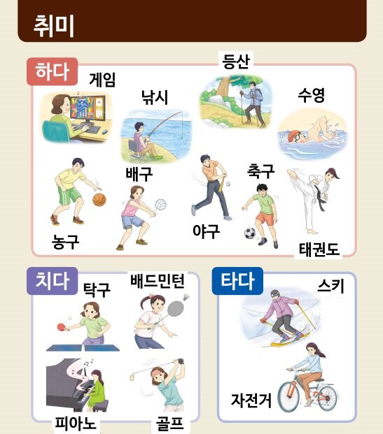 Добрый день, дорогие подписчики. Наконец-то, добралась до 2го урока. Как обычно, для начала словарь: 배드민턴을 치다 играть в бадминтон 자전거를 타다 ездить на велосипеде 등산을 하다 ходить/взбираться в горы 낚시를 하다 ловить рыбу 피아노를 치다 играть на пианино 게임을 하다 играть в компьютерные игры 탁구를 치다 играть в в настольный теннис Примерно это можно объяснить так: То что мы делаем руками/ногами - 하다 Там где мы чем-то бьем (или по клавишам в пианино) - 치다 Там где мы используем что-то, чтобы ехать - 타다 언제나/항상 всегда, постоянно 자주 часто 가끔 иногда 별로 не очень, не особо 거의 почти не 전혀 совсем не 취미 хобби 너무 слишком 일어나다 вставать, просыпаться 들어오다 входить 매주 каждую неделю 운동장 стадион 제 мой, свой 건강에 좋다 полезно для здоровья 꼭 обязательно 매일 ежедневно Слова файлом (все уроки (пройденные)- Напомню: после регистрации вам будут доступны онлайн учебники, в том числе на русском языке, в разделе Learning -> Textbooks нас интересует учебник 세종한국어2 (на данный момент это второй учебник на 5й странице) #корея #южная корея #к