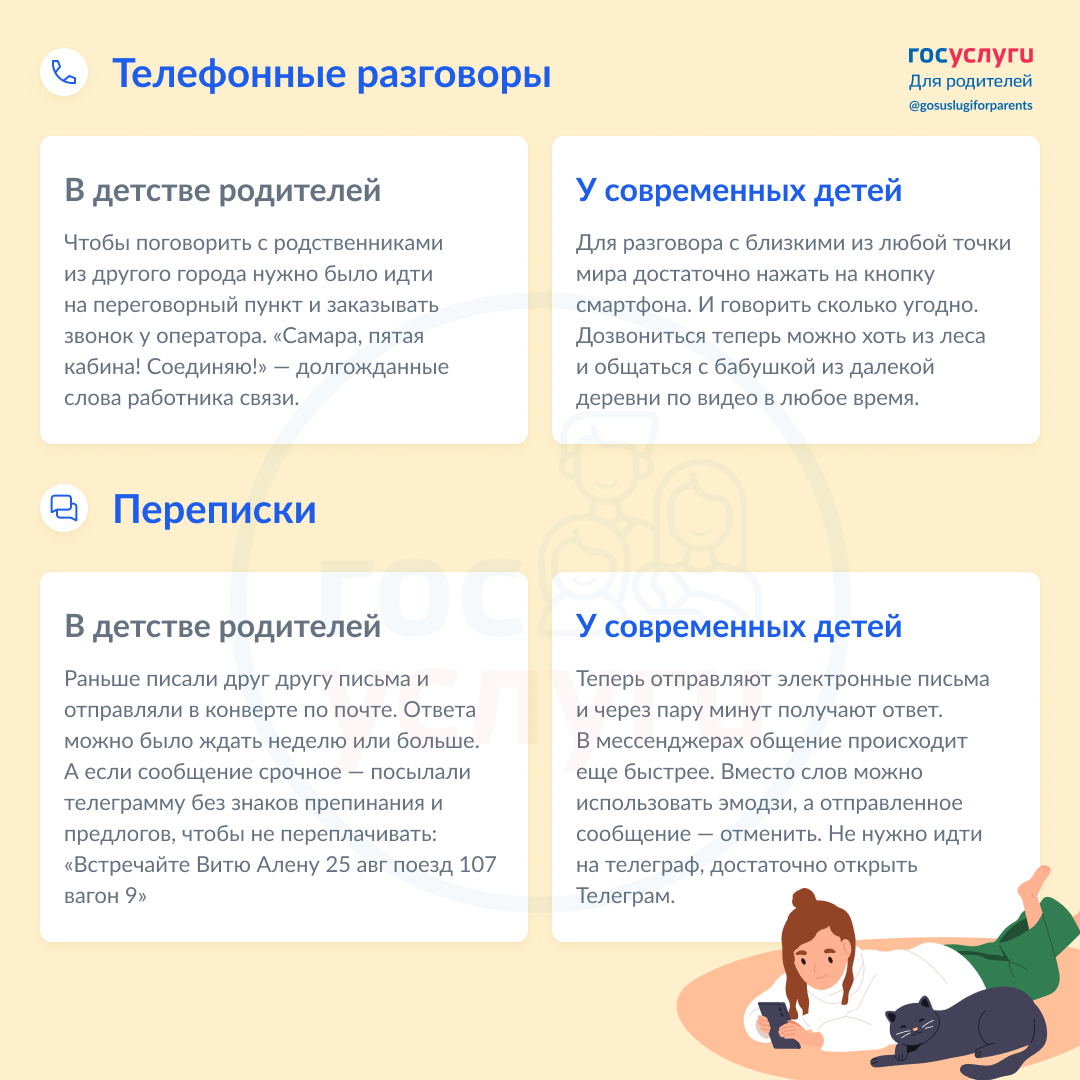 Почему нельзя было сделать 10 одинаковых снимков, зачем ходить за березовым соком и ждать субботы для просмотра сказки? Некоторые яркие воспоминания из детства родителей никогда не понять современным детям. В карточках — 11 явных отличий из детства мам и пап и современных детей. Как прежде уже никогда не будет. Но, может, это и здорово? @gosuslugiforparents