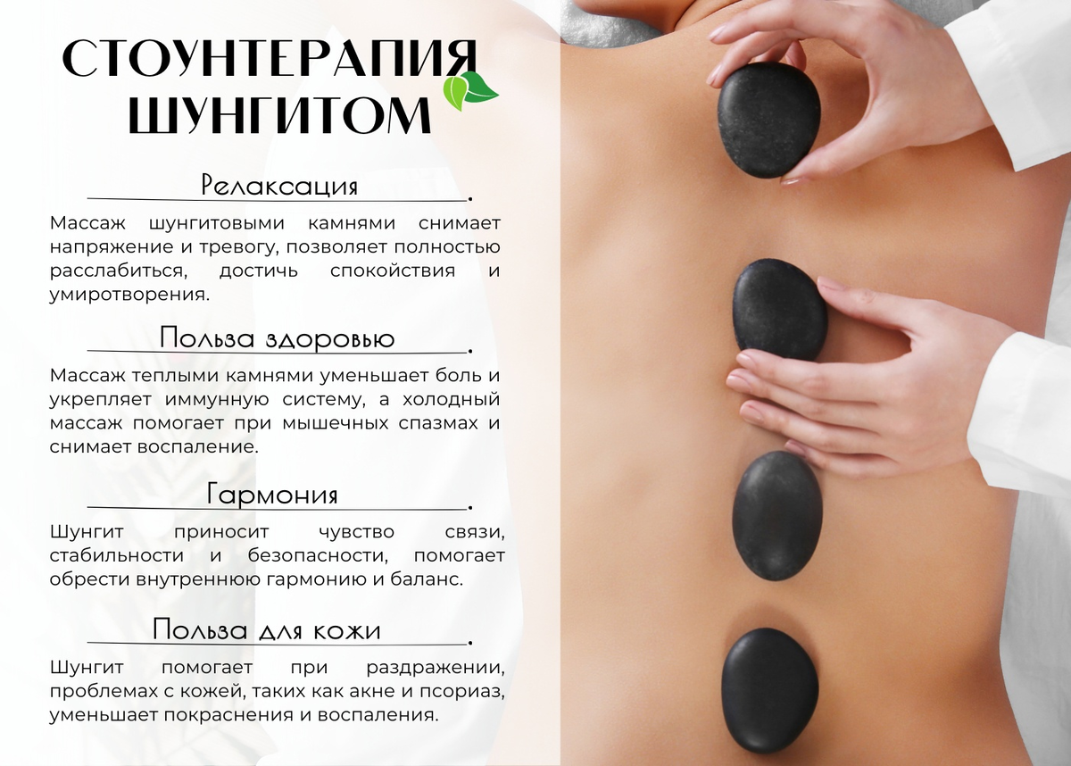 Если вы еще никогда не пробовали массаж камнями, то попробовать однозначно стоит! 😉💥И шунгит станет отличным выбором камня для этой процедуры. Стоунтерапия расширяет кровеносные сосуды, расслабляет мышцы, ускоряет обмен веществ и кровоток.