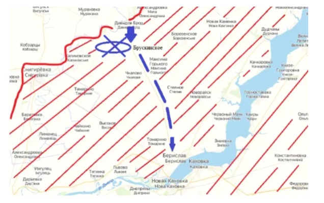 27 мая 15 вражеских танков и 16 БМП атаковали с целью прорыва нашего фронта на границе между Николаевской и Херсонской областями. Я сообщаю о выводах, сделанных по результатам этого сражения. Село Давыдов Брод расположено на окраине Херсонской области, на берегу реки Ингулец, которая образует границу с Николаевской областью. Правый берег реки обороняет 28-я отдельная моторизованная бригада ВСУ. Она носит название "Рыцари зимней кампании". Я бы сказал "печальные рыцари", потому что эта бригада не раз получала суровые уроки от нашей армии. Также вдоль границы области закрепились подразделения 35-й морской бригады и 63-й механизированной бригады ВСУ (постоянно дислоцированной в Хмельницкой области). По всей видимости, лучшие экипажи и танки из механизированных бригад сформировали отдельную боевую бронетанковую силу, поддерживаемую БМП морской пехоты. Теперь давайте посмотрим на карту. Пунктирная линия показывает планируемое направление атаки. Пройдя через Ингулец, вражеские войска устремл