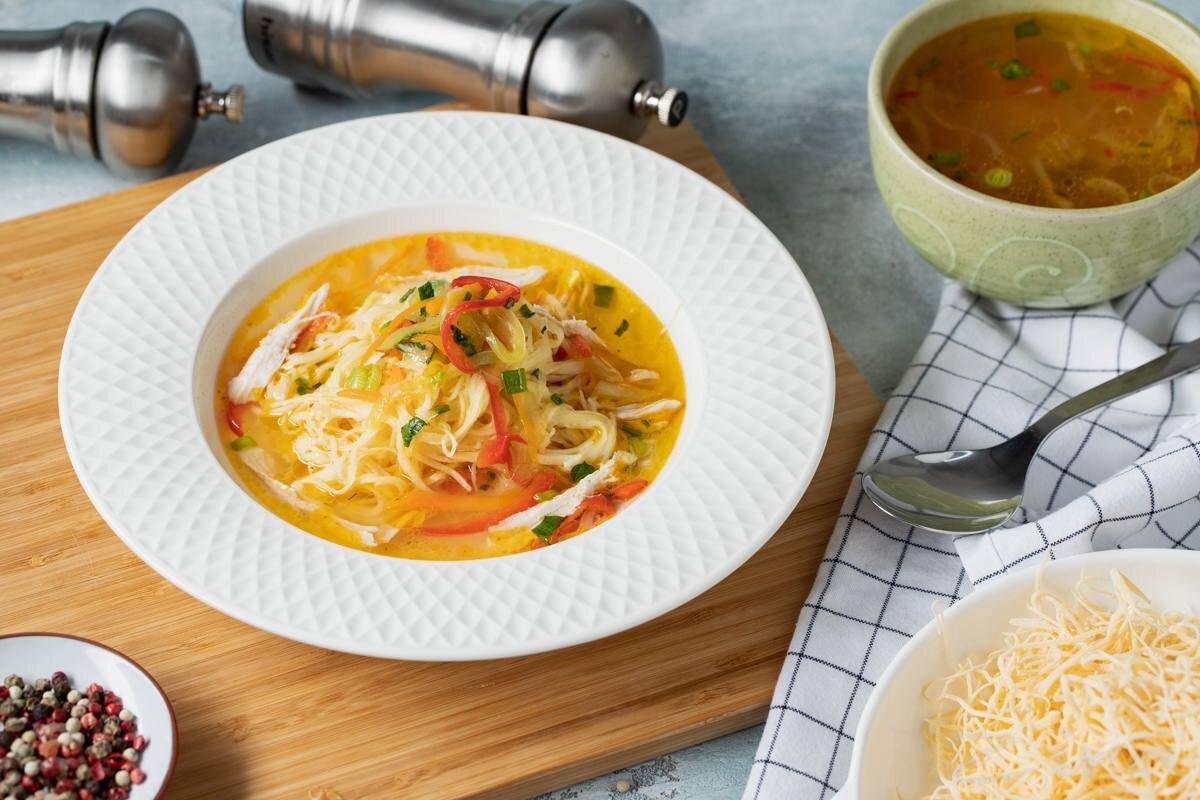 📖 Ингредиенты: - Куриное мясо - 400 г. - Морковь - 100 г. - Красный Болгарский перец - 100 г. - Лук - 2 шт. - Растительное масло - 3 ст. л. - Соль, перец - по вкусу - Лавровый лист - 2 шт. Для лапши: - Яйцо - 2 шт. - Мука - 200 г. - Соль - щепотка 🧑🏻🍳 Приготовление: 1. Смешать муку, яйца и соль, вымесить довольно плотное тесто. Завернуть в пленку и убрать на 20-30 мин. в холодильник. 2. Тесто раскатать в пласт толщиной 1 мм. 3. Тесто свернуть в рулет и нарезать лапшу шириной 2-3 мм., оставить сохнуть на столе минут на 20. 4. Курицу помыть, разделить на части, залить водой и поставить на огонь. Довести до кипения, убавить огонь и снять пену. 5. Посолить, добавить перец, лавровый лист и одну целую луковицу. Варить на среднем огне 30 минут. 6. В сковороде обжарить нарезанные соломкой лук, морковь и болгарский перец, отправить в бульон. 7. Курицу нарезать на мелкие кусочки. В бульон добавить лапшу и варить 2 минут. #суп #узбекскийсуп #уграош