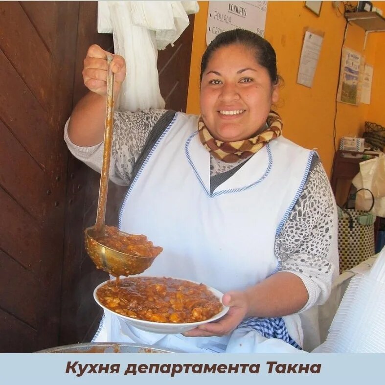 История кухни этого региона началась в колониальные времена. От кулинарных традиций других перуанских провинций она отличается тем, что еде здесь часто готовят в глиняных горшках на костре или в дровяной печи. По мнению местных это помогает улучшить вкус готового блюда. Базу такненской кухни составляют разные виды картофеля и кукурузы, острый перец ахи, мясо морских свинок - куев, баранина, свинина. Из птицы жители Такны часто употребляют в пищу утку. Она же входит в состав одного из традиционных для региона блюд – arroz con pato (дословно: рис с уткой). История этого блюда по-своему интересна. По сути это адаптированная на перуанский лад испанская паэлья. Готовить ее начали женщины из этой страны, переехавшие в Такну вслед за мужьями-конкистадорами. Они стремились сохранить рецепты Старого Света, но использовали для приготовления блюд доступные в Перу продукты. Больше всего по вкусу европейцам пришлась утка, называемая на кечуа нюнюма. Именно из нее стали готовить аналог испанской па