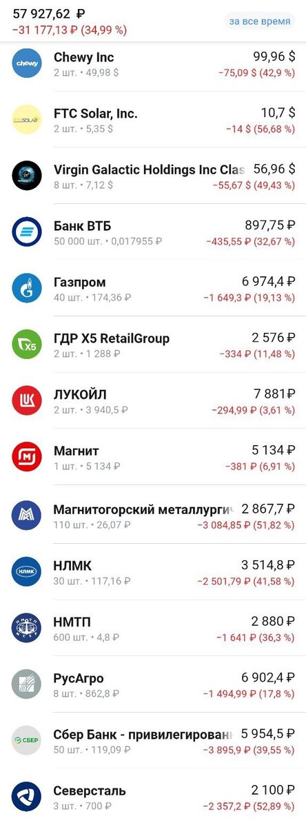 На данный момент мой портфель составляет 57 927 рублей из вложенных 87 500. Он весь в красной зоне.