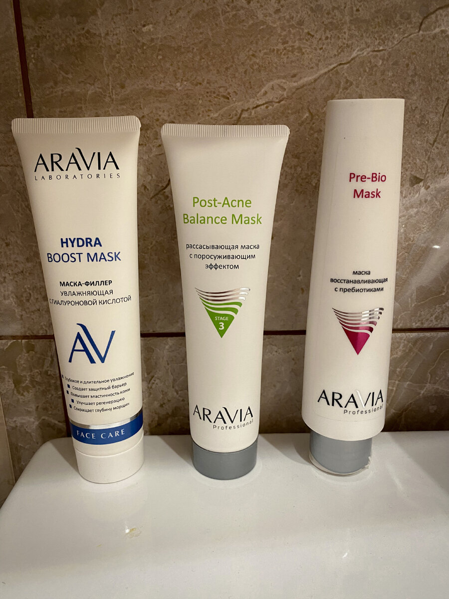 Я думала, что у меня их две и я купила на волне импортозамещения 😂. Но - делая фото вспомнила, что есть ещё несколько средств. И они куплены ещё в прошлом году. Но там далеко не все маски, соответственно напишу только про одно их тех средств. Aravia laboratories Hydra boost mask. Маска увлажняющая, отдушки практически отсутствуют. По мне это аромат простого детского крема. Маска прекрасно увлажняет кожу, делает ее мягкой. После использования маски тон становится более ровным и кожа будто сияет. Оставшиеся две маски одной линии бренда (я не знаю в чем различия у них). Aravia professional: Post-Acne Balance Mask. Это рассасывающая маска с поросуживающим эффектом. У маски так же нет отдушек. Заметила, что даже с первого использования пост акне стали менее яркими. Маска не сушит кожу. Маска бережно отшелушивает кожу, не раздражая ее. Фото состава в карусели. Pre-Bio Mask. Восстанавливающая маска с пребиотиками. Она обладает слегка уловимым ароматом. Маска защищает кожу от небл