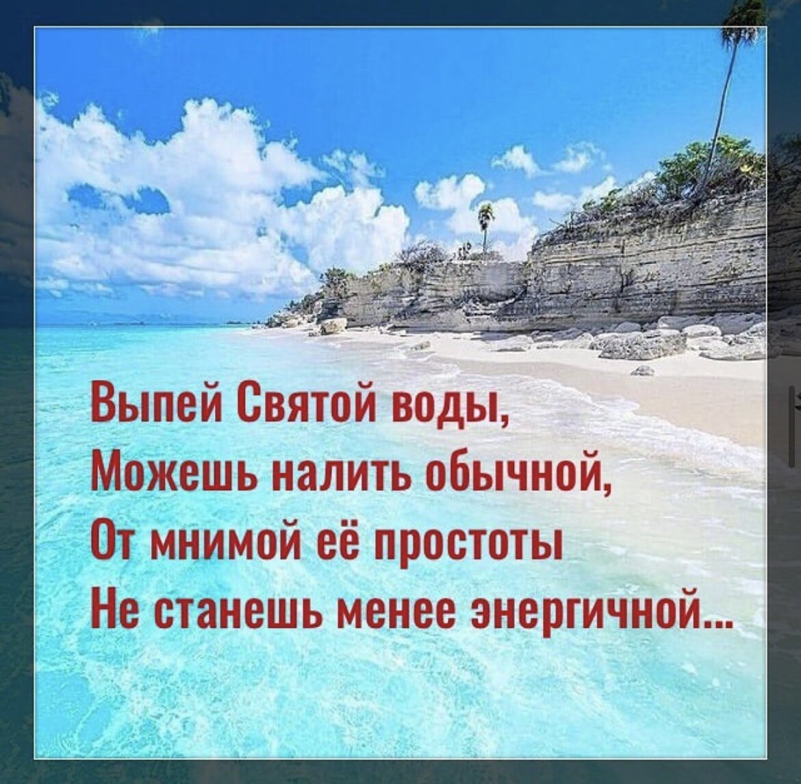 Выпей Святой воды, Можешь налить обычной, От мнимой её простоты Не станешь менее энергичной. Вода убирает сглаз, Чистит тела и сосуды, Жать помогает на газ, Любимый напиток Будды! Если устала, не жди, Что ночь тебе даст силы, Не зря с неба льются дожди, Без воды крепче только могилы. Наполняй влагой клеточки все, Тело скажет тебе спасибо, Энергии много в воде, Станешь быстрой, как в море рыбы! Утром, на ночь один лишь стакан Очистит в момент разум, Не закрывай с неба кран, Пусть тела все наполнятся сразу. 💫