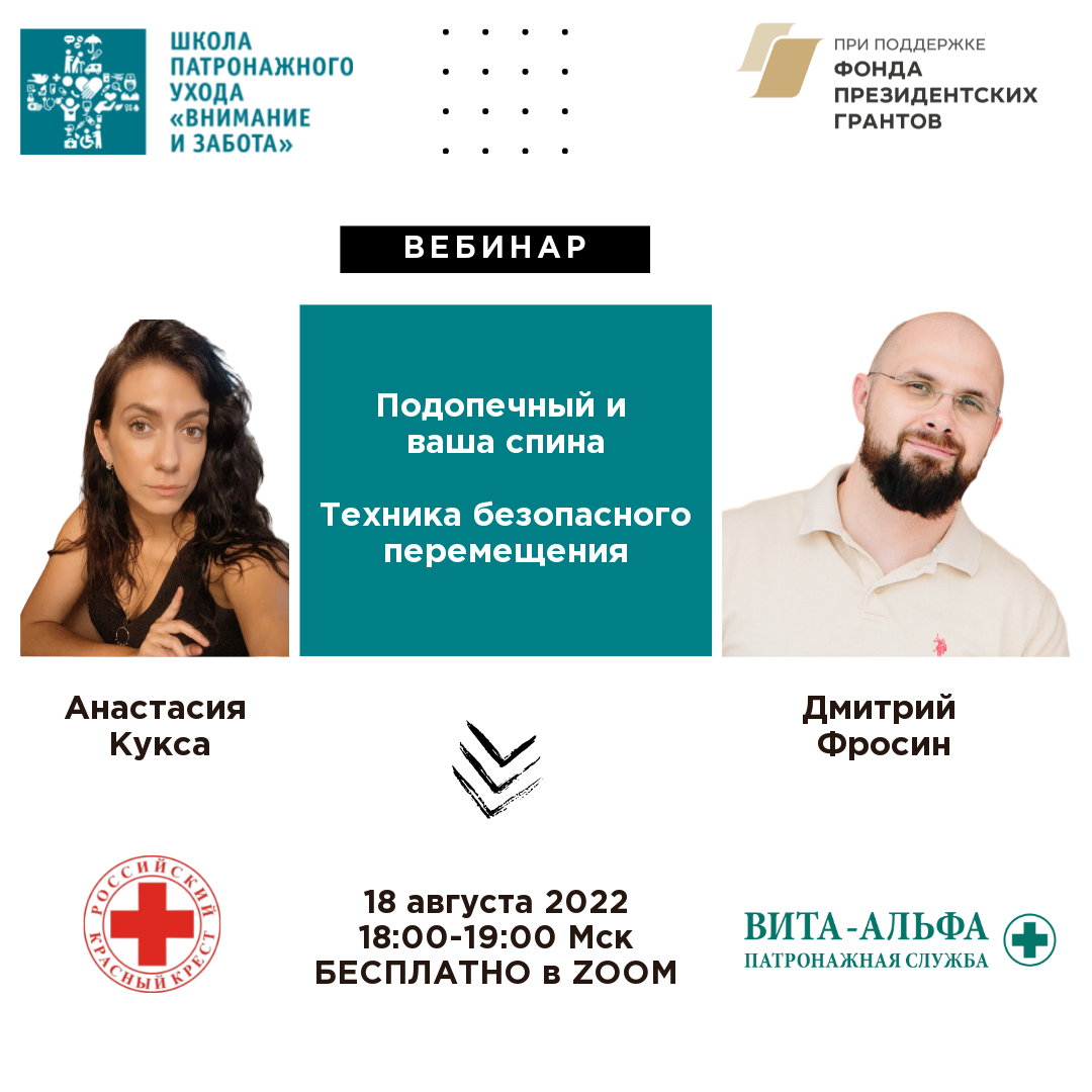 С января этого года мы обучаем еще 28 сотрудников НКО из разных регионов страны профессии «Тренер-преподаватель по долговременному уходу». Наши студенты прошли теоретический и практический курс, получили дипломы и под нашим наставничеством начинают проводить свои первые вебинары. Приглашаем вас на вебинар в Zoom «Подопечный и ваша спина. Техники безопасного перемещения». Дата и время: 18 авг. 2022 г. 18:00 по московскому времени Спикеры – тренеры-преподаватели: Кукса Анастасия Игоревна – руководитель Артёмовского отделения ООО «Российский красный крест», медицинская сестра. Фросин Дмитрий Вячеславович – руководитель патронажной службы «Вита-альфа» г. Казань Поднять, перевернуть, переместить лежачего больного – научиться делать это правильно очень важно и для больного, и для лица, обеспечивающего уход. Основная нагрузка при проведении всех этих манипуляций ложится на позвоночник ухаживающего. Спина страдает в 90% случаев, так как мало кто имел достаточную постоянную физическую нагрузк