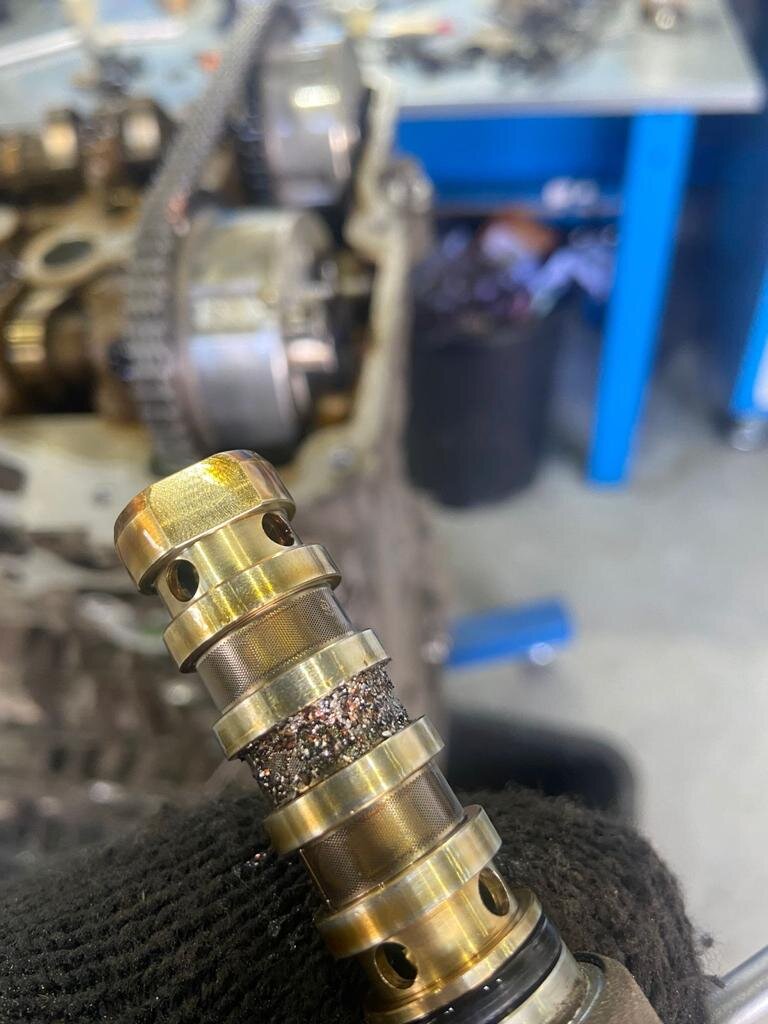 Выполняем капитальный ремонт двигателя G4KE для KIA Optima, дата производства авто декабрь 2013 года. Автомобиль приобретен на пробеге около 70000 км, использовалось масло Shell и заменялось каждые 15000 км. На пробеге около 175000 км стук в моторе вынудил владельца отправить авто на замену ГРМ. Через неделю ГРМ заменили, однако стук не ушел. Далее мастера догадались провести осмотр вкладышей, объявили владельцу за полную капиталку мотора около 400000 ру и так машина оказалась у нас. Мотор демонтирован, на сетках клапанах VVTi много стружки Внутри мотор ровного золотого цвета Цвет цветом, а вот распредвалы и постель ГБЦ изношены Продолжаем разбор мотора, все отложения скопились в картере ДВС Шатун 1го цилиндра болтается на шейке, здесь провернуло вкладыши Остальные шатунные вкладыши так же были готовы капитулировать и с легкостью вываливаются с посадочных мест Прочие шатунные шейки коленвала так же подраны И что самое примечательное - все коренные вкладыши так же значительно изношены.
