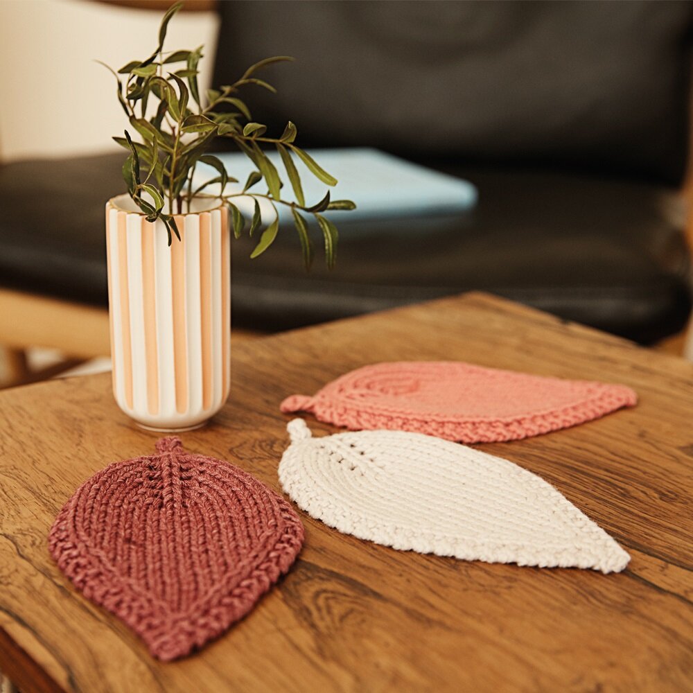 РАЗМЕР 16 x 10 см ВАМ ПОТРЕБУЕТСЯ Пряжа (55% мериносовой шерсти, 45% хлопка; 50 г/124 м) — 1 моток белой, 1 моток светло-лососевой, 1 моток коричневой; спицы №4. УЗОРЫ И СХЕМЫ ЛИЦЕВАЯ ГЛАДЬ Лицевые ряды — лицевые петли, изнаночные ряды — изнаночные петли. В круговых рядах все петли провязывать лицевыми. 1 ПРИБАВКА ВПРАВО Перевести протяжку между петлями движением «на себя» на левую спицу и провязать ее лицевой. 1 ПРИБАВКА ВЛЕВО Перевести протяжку между петлями движением «от себя» на левую спицу и провязать ее лицевой. 1 ПРОСТАЯ УБАВКА 1 п. снять, как лицевую, 1 лиц., затем протянуть ее через снятую петлю. 1 ДВОЙНАЯ УБАВКА 1 п. снять, как лицевую, 2 п. провязать вместе лицевой и протянуть через снятую петлю. 2 П. ПРОВЯЗАТЬ ВМЕСТЕ ИЗНАНОЧНОЙ С НАКЛОНОМ ВЛЕВО 2 п. перевести на правую спицу, затем перекрутить (так, чтобы 2-я п. оказалась спереди, а 1-я п. сзади), вернуть на левую спицу и провязать вместе изнаночной за задние стенки. Листья вяжутся двойной нитью. ПЛОТНОСТЬ ВЯЗАНИЯ 18 п. х 1