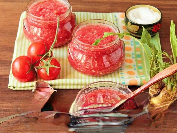 Ингредиенты Помидоры - 700 г Корень хрена - 80-100 г Чеснок - 30-50 г Соль - 1 ч.л. Хренодёр с помидорами - традиционный острый соус-закуска. Измельчённые корни хрена придают хренодёру неповторимый вкус и аромат. В сочетании с томатами и чесноком получается отличный соус. Его подают к мясу, к рыбе, птице, используют как закуску, с хлебом. Хороша эта заготовка и для пельменей и мантов. Остроту соуса вы можете регулировать по своему вкусу, добавляя больше или меньше хрена и чеснока. В некоторых рецептах добавляют соль и сахар, а также растительное масло. Я использую только немного соли. И хрен, и чеснок, и соль - отличные консерванты, поэтому и сырой хренодёр отлично хранится. Хранить заготовленный на зиму хренодёр с помидорами нужно в прохладном месте: в холодильнике, в погребе. Баночки нужно как следует простерилизовать, поскольку продукты не подвергаются тепловой обработке. Подготовим продукты по списку. Хрен помоем, почистим и нарежем небольшими кусочками, чтобы проще было его измель