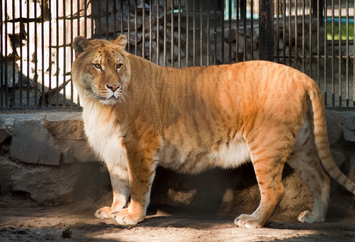 Лигр – самый крупный представитель кошачьих. Путём скрещивания двух разных видов, были выведены эти прекрасные кошки. Так что в дикой природе их встретить невозможно. Лигр - гибрид самца льва и самки тигрицы. Долгое время ученые и не знали, что эти два вида возможно скрестить между собой, хотя они относятся к одному роду. Также от львицы и тигра возможно получить гибрид – тигон или тигролев. Лигр самый большой представитель кошачьих. До этого его место занимал Амурский тигр. Внешний вид Лигр – очень крупный. Его вес может превышать 400 кг, а средний рост в холке – примерно 100 см. Вытянувшись во всю длину, лигр может достигать 4 метров. Ширина пасти этого хищника растягивается до 50 см. На первый взгляд этот зверь напоминает льва с негустой гривой. Геркулес - самый крупный лигр. Его высота - 124 см, а вес более 418 кг. У лигров самцов грива либо совсем "жидкая", либо она отсутствует полностью, но иногда присутствуют рыжие бакенбарды. Их головы в среднем на 40 процентов больше, чем