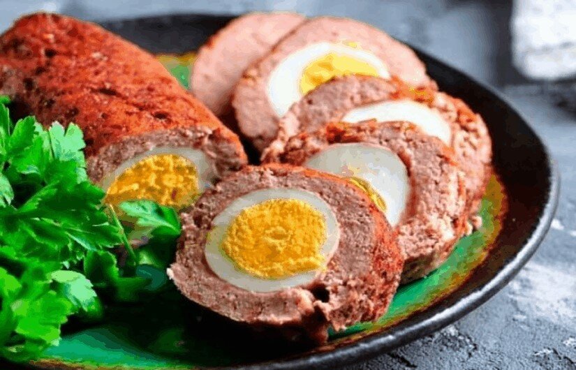 Ингредиенты: фарш (свино-говяжий) – 1кг., белый хлеб – 2 ломтика, яйца – 4 шт. (варёных), лук – 2шт., сыр – 150гр., соль, перец, зелень. Хлеб размочить в воде или молоке, отжать. Лук натираем или мелко режем. Смешиваем всё с фаршем, добавляем соль, перец. Вымешиваем и отбиваем фарш пару минут. На лист противня уложить фольгу, на неё в виде прямоугольника, выложить весь фарш. Посыпаем фарш натертым сыром и зеленью, а по центру в ряд выкладываем яйца. Приподнимая края фольги, формируем рулет, закрываем все щелочки. Рулет полностью обернуть фольгой, в противень наливаем немного воды и запекаем 50 минут, при температуре 200С. Затем фольгу раскрыть и запекаем рулет ещё минут 15, до появления корочки. Готово и Приятного Аппетита! #мяснойрулет #яйца #проеду #рецепт #кулинария Подпишись, ставь лайк, забирай рецепт!