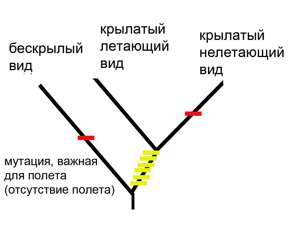 В данном примере это то, что соответствовало бы реальности. Все желтые признаки, которые объединяют крылатый летающий и крылатый нелетающий виды произошли у их общих предков, и на реконструкцию топологии в данном случае не влияют. Конечно, сейчас это просто иллюстрация, нам потребуется много внешних групп и надо будет правильно укоренить филогению, чтобы правильно ее поляризовать.