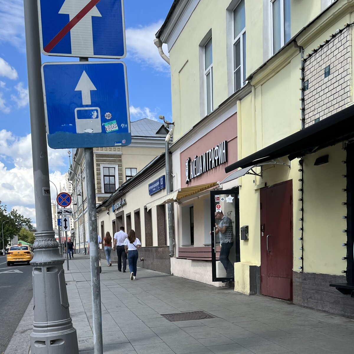 Вечно суетная и многолюдная Таганка, будто вовсе и не центр у Садового, а где-то дальше за ТТК. Идти от метро налево, мимо Театра на Таганке вниз по Верхней Радищевской, вдоль вывесок разного общепитовского толка. Между сетевым Lambic и отделением банка «Открытие» бело-розовая стена, полосатая маркиза, скамейка, одно окно, одна дверь и белая вывеска «Алеша и Графин» – название небольшого бара, где местным и залетным наливают домашние настойки и кормят чебуреками. Последний визит туда случился практически сразу после открытия, почти два года назад, осенью 2020-го. Дата и время посещения — 22 июля 2022, пятница, 12:40 При моем канале появился чат в Яндекс.Дзен - присоединяйтесь . Там я отвечаю на ваши вопросы. Интерьер и атмосфера Внутри скрывается небольшое обеденное пространство, разделенное на две зоны. При входе бар, стойка и пара высоких столов, следом разделительные колонны и еще один отсек для трапезы с окном в решетке и туалетом, защищенным кодовым замком. Оформление самое прост